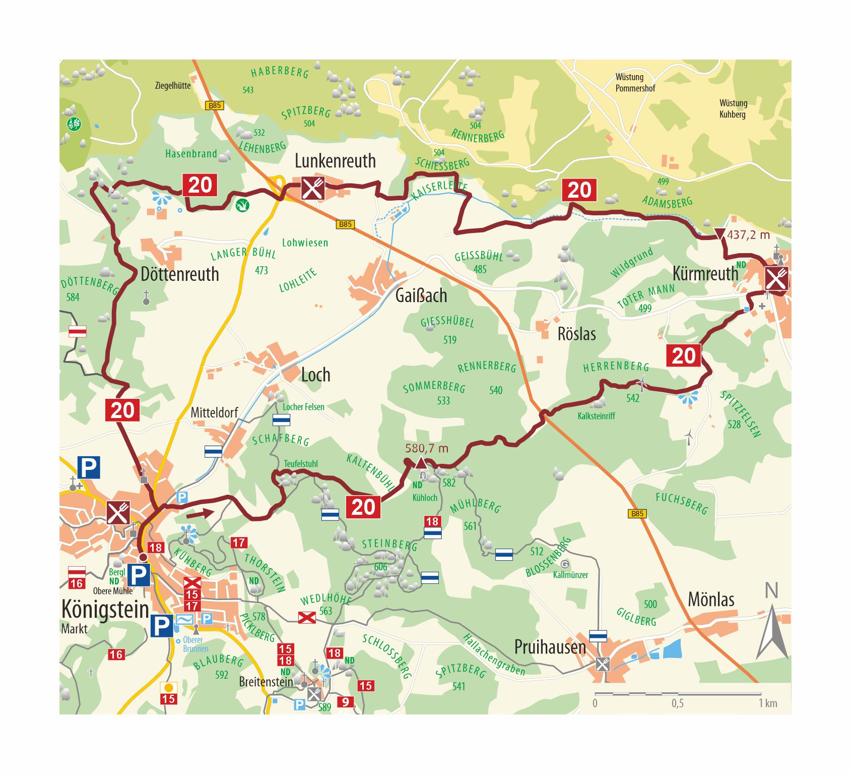 Wir starten am Marktplatz Richtung Mitteldorf. Vor dem Ortsende rechts, entlang eines Wiesenwegs, gelangen wir durch Buchenwald zum Teufelstuhl, bevor es wieder hinab in ein Waldtal geht. Steil steigt unser Pfad nun hinauf zum Kühloch, einer der ältesten Wohnhöhlen der Oberpfalz. Mit vielen Windungen nimmt unser Weg, mit leichtem Gefälle die B 85 überquerend, Kurs auf den Ostteil der Königsteiner Kuppenalb. Wieder ansteigend, vorbei am Kalksteinriff des Herrenberges und über eine Hochfläche mit Blick zum Oberpfälzer Wald, erreichen wir Kürmreuth, welches zu einer Rast einlädt.