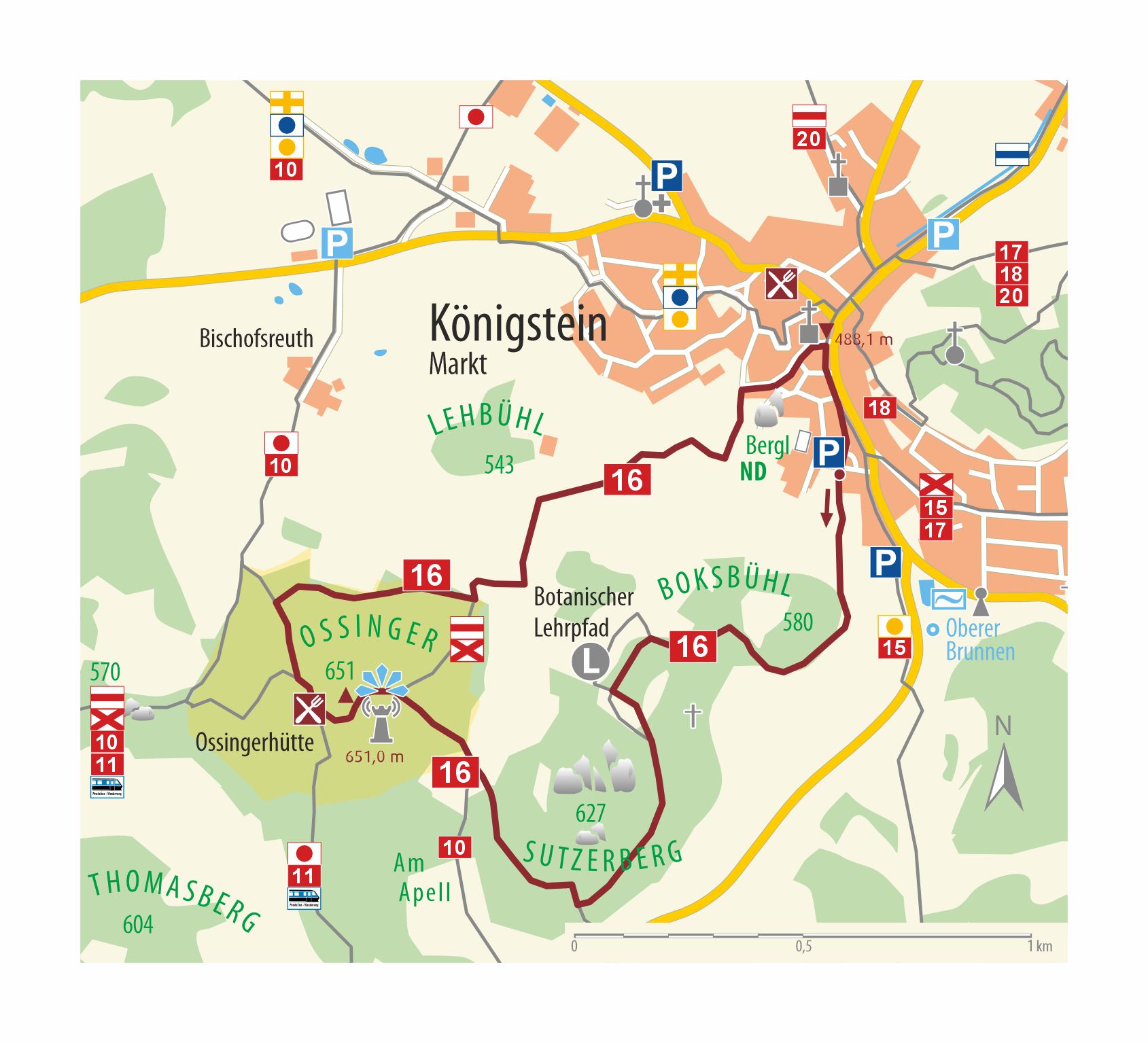 Gegenüber dem Parkplatz im Schulweg folgen wir der auf einem Feld- und Waldpfad bis zum Botanischen Lehrpfad. Die Sicht genießend, geht es links zur Schutzhütte. Wir wenden uns anschließend links hinein in den Wald und wandern bis zu einer Lichtung. Diese überqueren wir und folgen den Schildern zum Ossinger. Wir steigen stetig an und erreichen die Hänge des Ossingers, eine der höchsten Erhebungen der Frankenalb. Ein anhaltend steiler Aufstieg mit Geländer bringt uns hinauf. Zu empfehlen ist der Ausblick vom Turm.